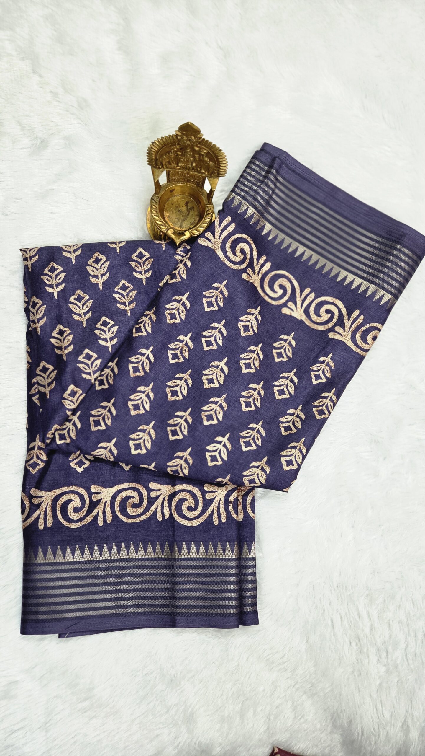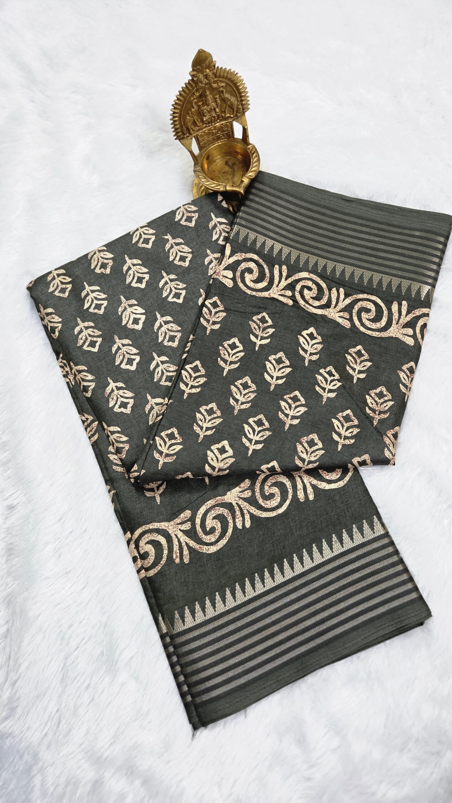 The contrasting striped and swirl borders enhance its elegance, making it suitable for both casual and festive occasions. Lightweight and comfortable, this saree is perfect for long wear, whether at work, family gatherings, pooja ceremonies, or cultural events.
