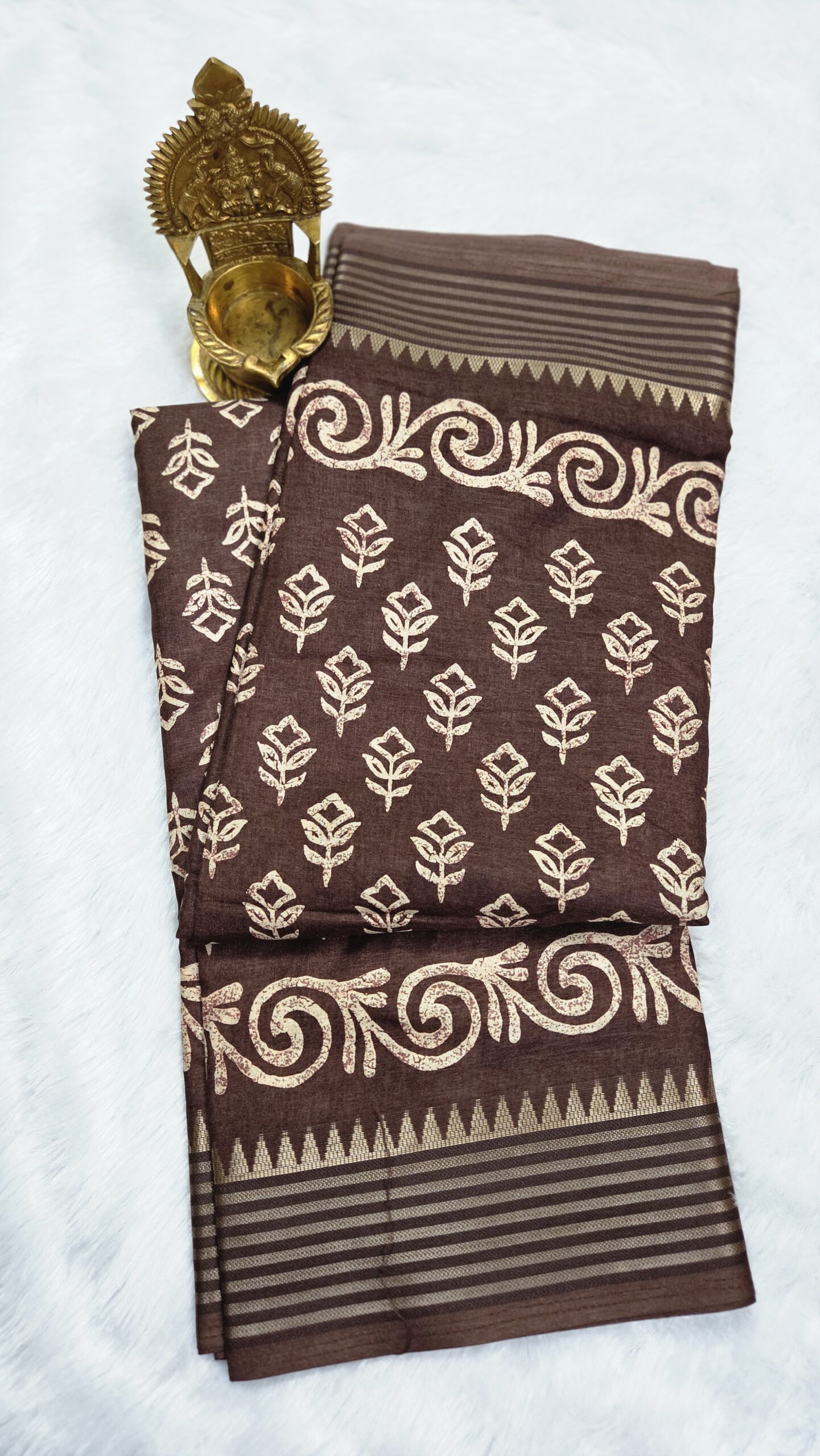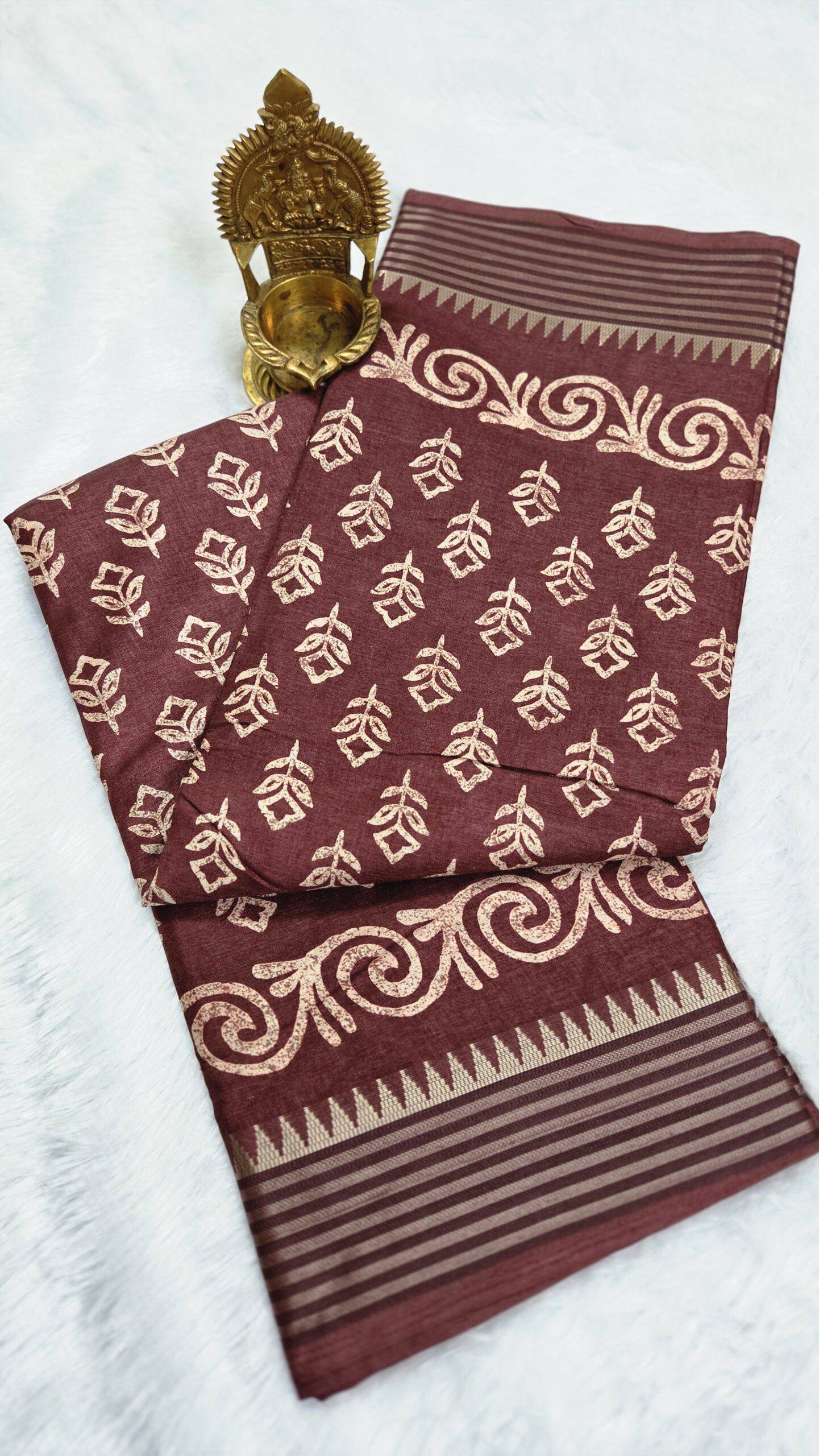 Add timeless grace to your wardrobe with this Chocolate Brown Hand Block Printed Cotton Saree from Nirvi Boutique. Crafted with soft, breathable cotton, this saree features beautiful traditional leaf motifs printed using authentic hand block techniques, giving it a rich ethnic charm.