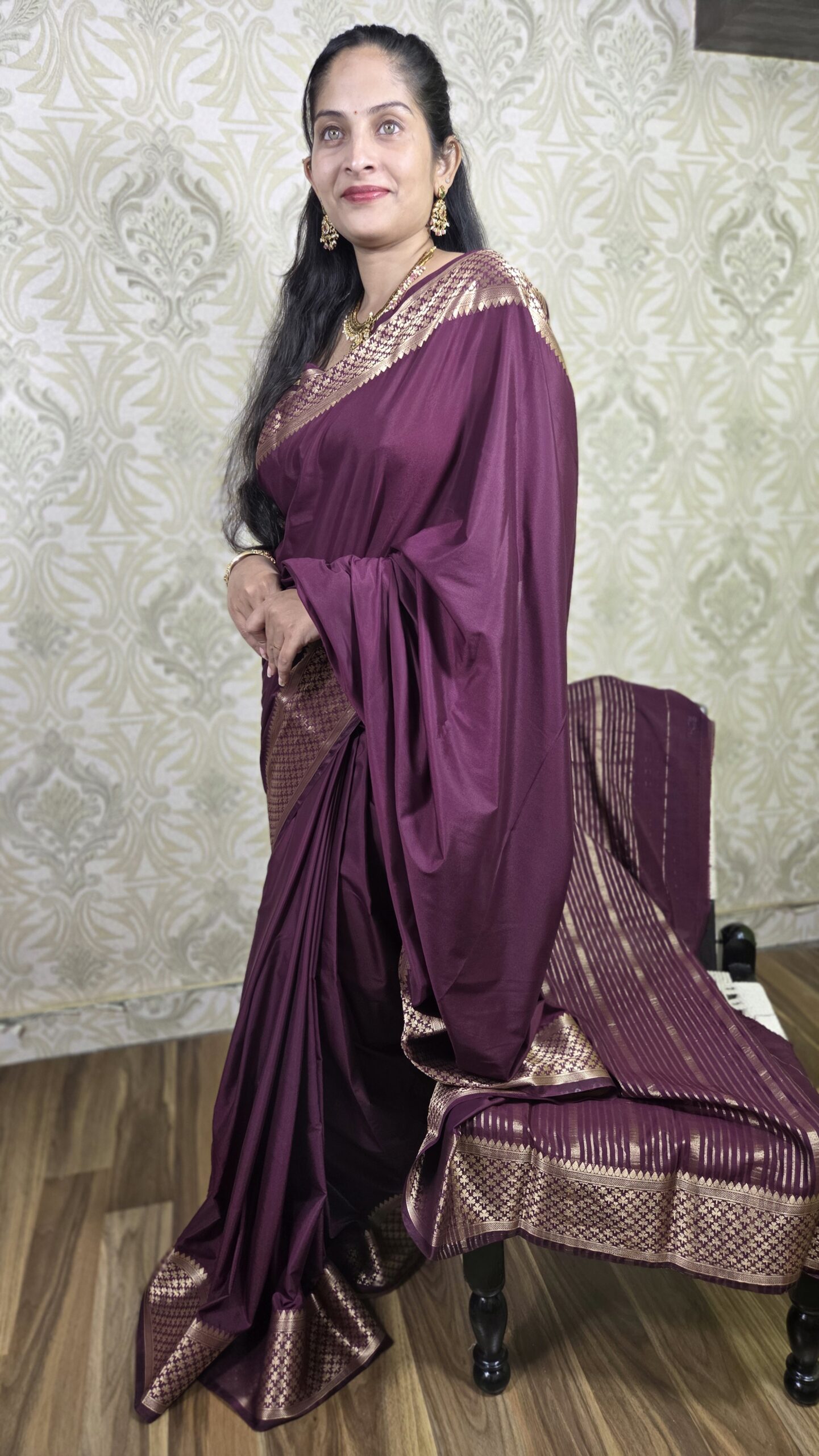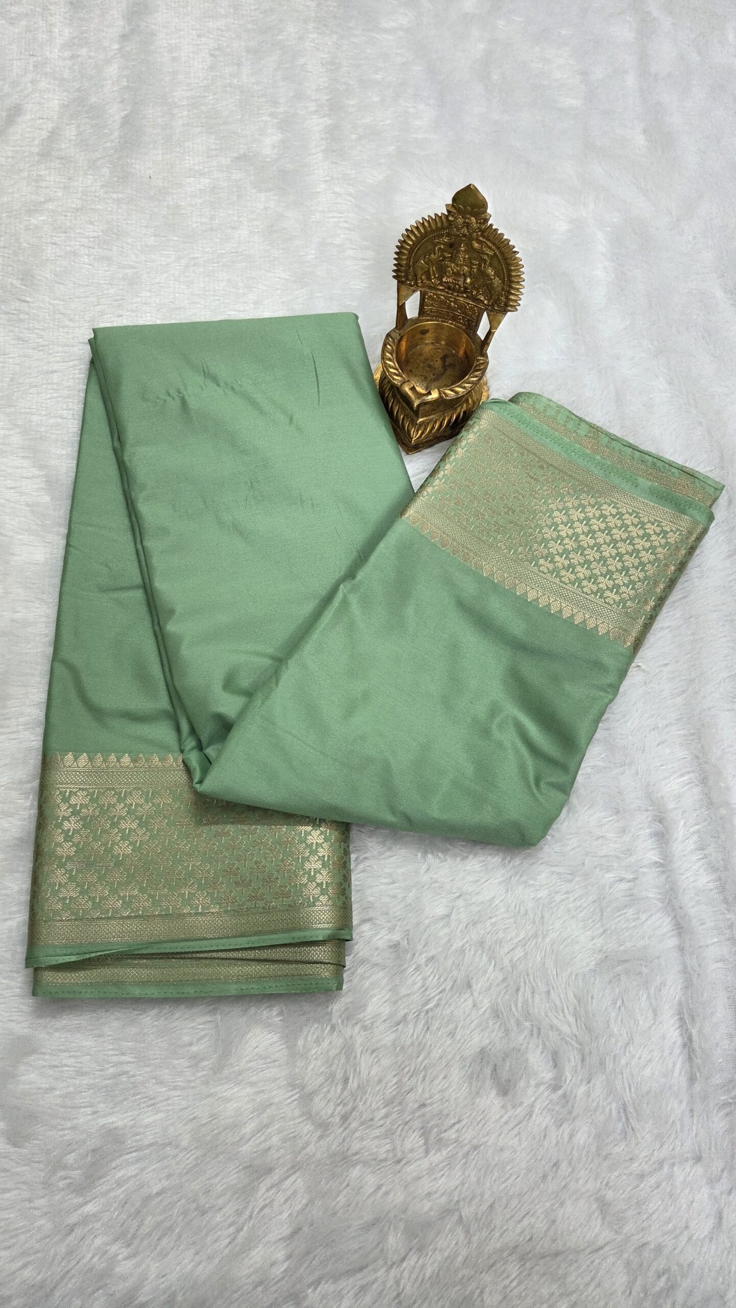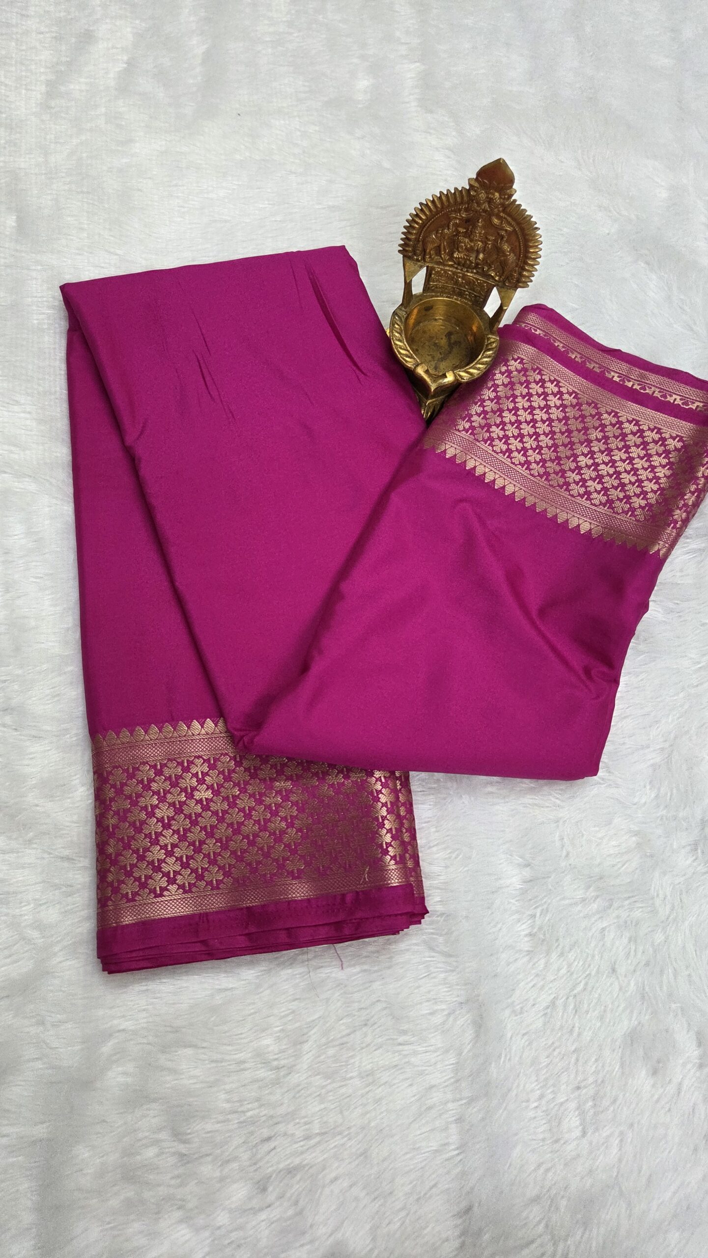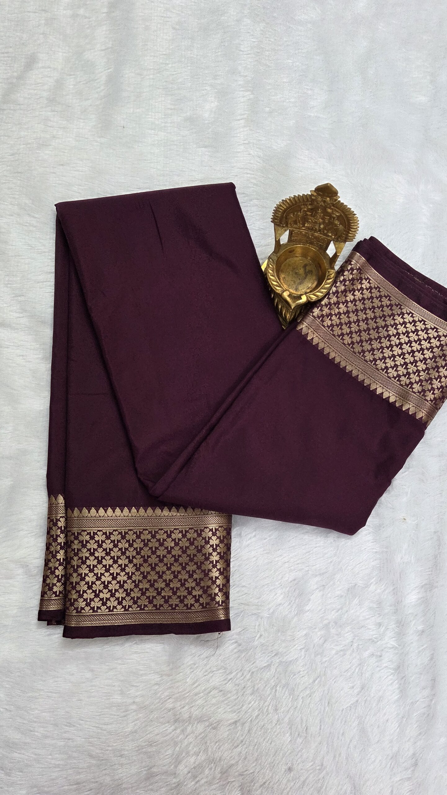 Elegant semi Mysore crepe saree featuring a beautiful leaf-pattern zari border, offering a perfect blend of comfort, tradition, and modern sophistication.